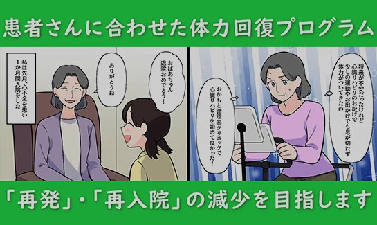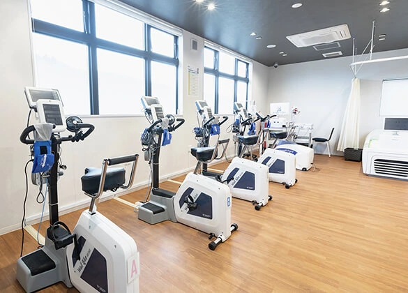 心疾患の治療後や予防目的で、心臓リハビリテーションを提供しています。心臓に負担をかけすぎないよう、熟知した専門のスタッフが患者さんの状態に合わせたプログラムを作成し、安全に運動療法をおこないます。定期的なリハビリへの参加は、心肺機能の改善だけでなく、再発予防や生活の質の向上にも繋がります。