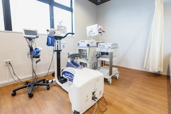 自転車エルゴメーターを漕ぎ始め、徐々に負荷を上げていきます。症状や体調に異常がないか確認しながら、最大運動耐容能に達するまで運動を継続します。